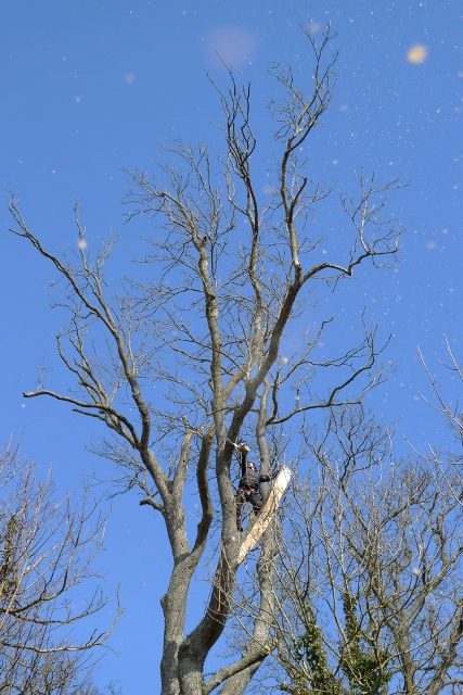 Removing top of dangerous ash tree at New Timber, Mid Sussex